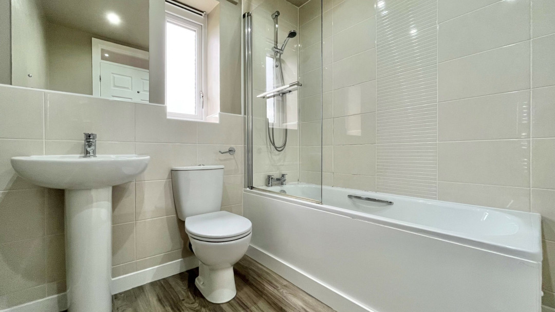 Low level WC, wash basin, panelled bath with shower over, towel radiator, part tiled walls, spot lighting, window to rear.