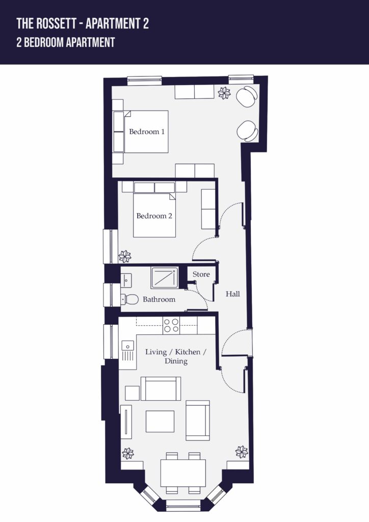 The large open plan kitchen and dining area is specifically designed for collaboration, games nights or a cosy nights in. You’ll also find a two good sized double bedrooms and a bathroom. With apartments at the Rossett coming with plenty of storage for modern convenience.